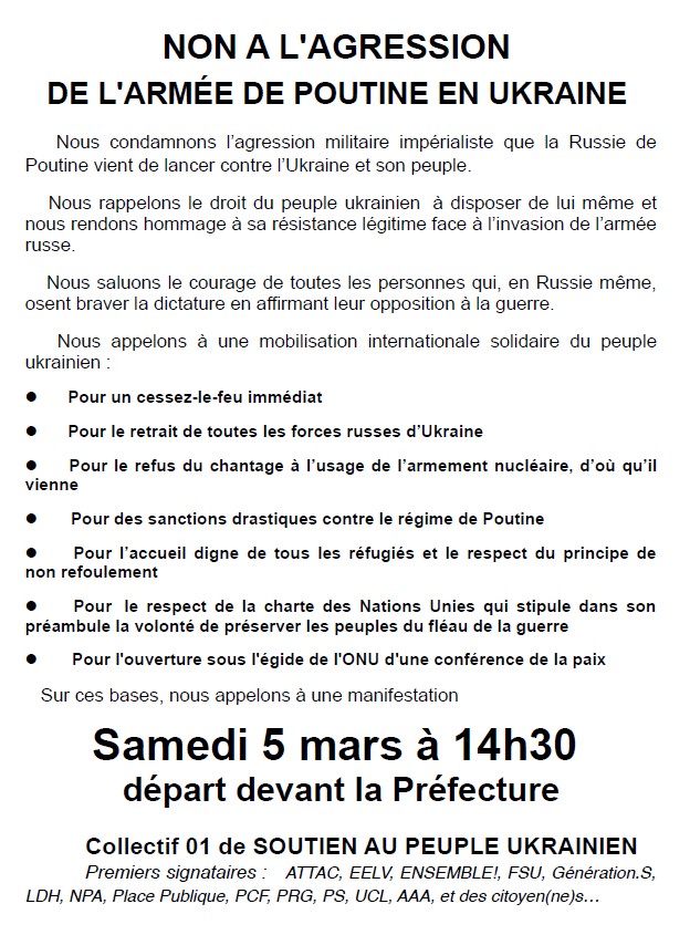 Les premiers signataires du collectif 01 de soutien au peuple ukrainien: ATTAC, EELV, ENSEMBLE!, FSU, Génération.S, LDH, NPA, Place Publique, PCF, PRG, PS, UCL…
