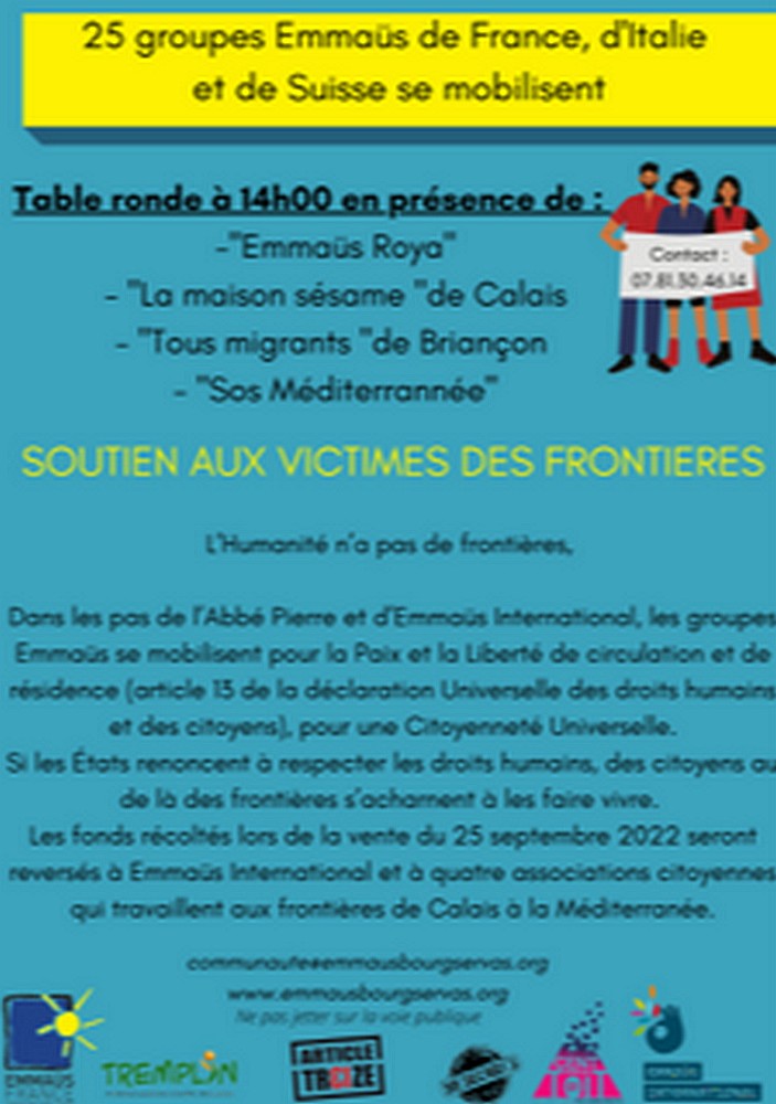Emmaüs Servas organise un grand évènement régional (et même à portée nationale) puisque la vente organisée le 25 septembre est destinée à aider financièrement les entités qui interviennent aux frontières …de Calais à la méditerranée.Des représentants de ces entités seront présents () et la table ronde sera consacrée au problème de la libre circulation des migrants. …………………..(Bruno)