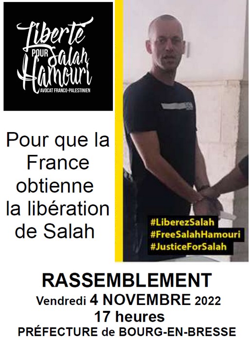 Le comité de l’Ain de soutien à Salah vous appelle à participer nombreuses et nombreux à une manifestation le vendredi 4 novembre à 17 heures. Rassemblement devant la préfecture, marche jusqu’à la Place de l’Hôtel de Ville de Bourg en Bresse.