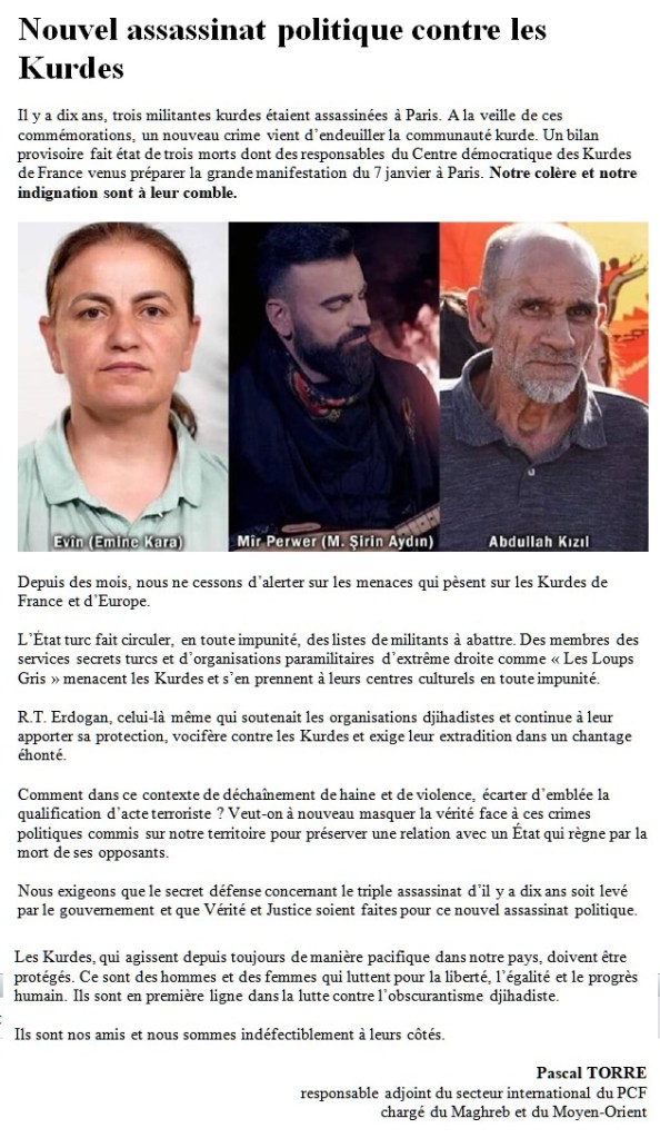 26 décembre 2022 pcfbourgbresserevermont Assassinat de trois kurdes Partager : Cliquer pour partager sur X(ouvre dans une nouvelle fenêtre) X Cliquez pour partager sur Facebook(ouvre dans une nouvelle fenêtre) Facebook J’aime chargement… Similaire