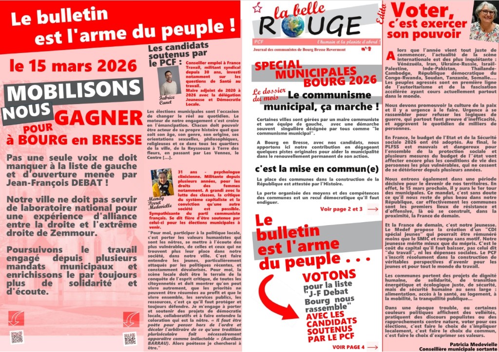 10 mars 202610 mars 2026 pcfbourgbresserevermont La belle Rouge, n°5, mars 2026 et ici en PDF journal-PCFfévrier-26-2Partager : Partager sur X(ouvre dans une nouvelle fenêtre) X Partager sur Facebook(ouvre dans une nouvelle fenêtre) Facebook J’aime chargement… Similaire